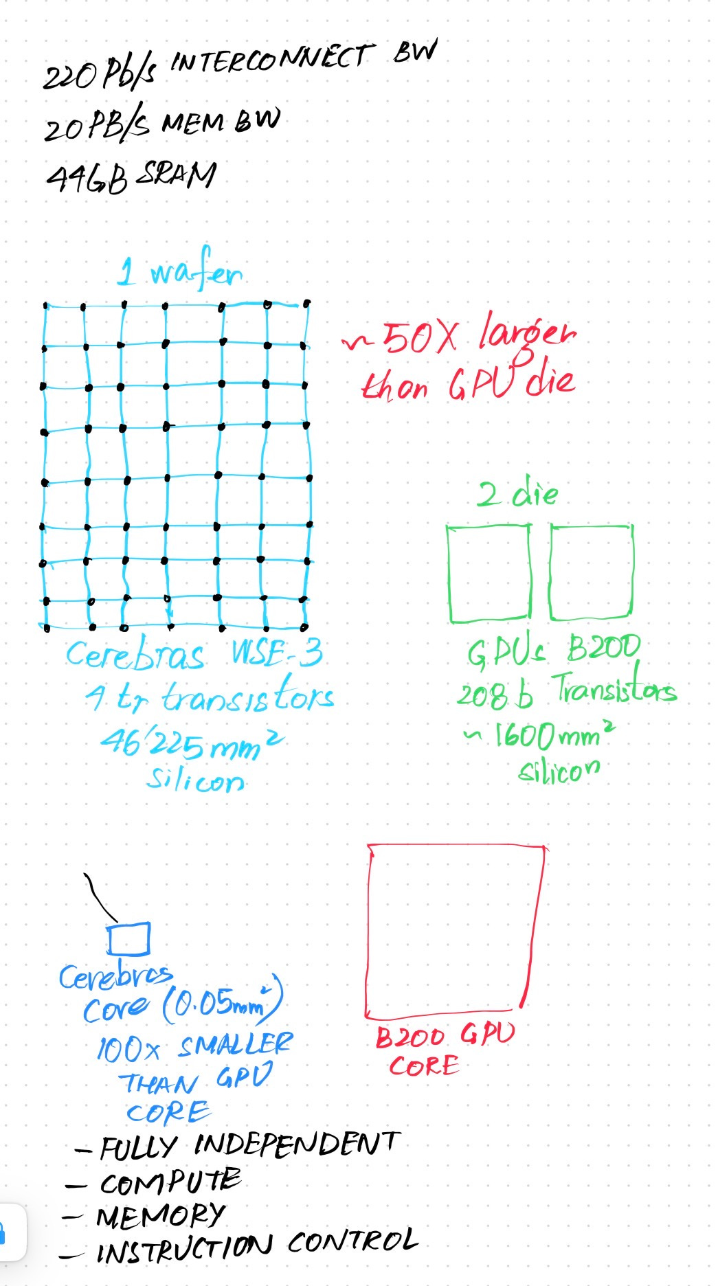 Compared to a standard GB200 Nvidia GPU, this single wafer offers 44 GBs of high speed SRAM on-chip memory (right on the silicon wafer), 20 PB/s of memory bandwidth between the core(s) and SRAM, and 220 Pb/s of interconnect bandwidth across the entire wafer. This single wafer is almost fifty times larger than a B200 GPU die, and packs a massive array of 4-trillion transistors on it compared to billions on B200.