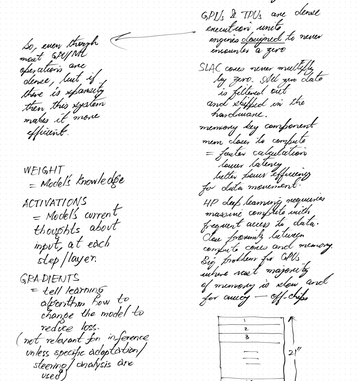 A neural network’s computations can happen on a series of GPU cores in parallel, but the model’s weight cannot be stored inside GPUs. In order for computations to be meaningful, model weights—the model’s knowledge—have to be moved back and forth all the time. This is expensive: it requires energy, and is prone to I/O latency (among other complexities). On top of that, a given state-of-the-art (SOTA) model today has billions of weights (parameters) if not trillions. The closer those weights are to compute, the faster the computation can happen. The closer they are, the less energy is needed to move weights back and forth. That, in and of itself, ultimately is the big problem with AI infrastructure today.