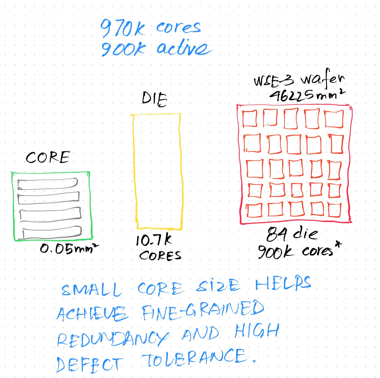 With fine-grained redundancy (routing around defective chips), ultra-dense compute (many tiny independent chips on a single big piece of silicon), and self-healing routing fabric, they are able to make every wafer a high yield, fully functioning processor with high speed on-chip memory available.